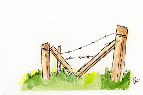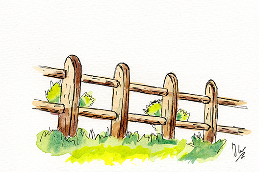 De laatste tijd kijk ik tijdens mijn wandelingen in Tiel, waar ik woon, steeds meer om me heen. Vooral de plekjes langs de rivier spreken me aan. Er is iets rustgevends aan het Nederlandse platteland – de open velden, de oude hekken die al tientallen jaren de grenzen markeren. Ik merk dat ik steeds vaker stop om deze eenvoudige taferelen te schetsen: houten palen, prikkeldraad dat het middaglicht vangt, wildgroeiend gras aan de voet ervan.