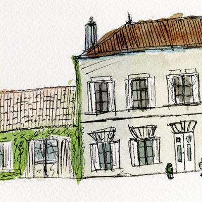 Een rustieke inkt- en aquarelschets van het statige Château Saint-Hilaire, omgeven door weelderig groen onder een stralende Franse zon.