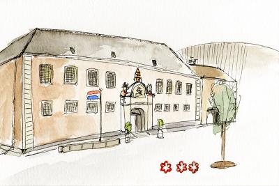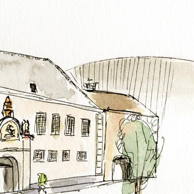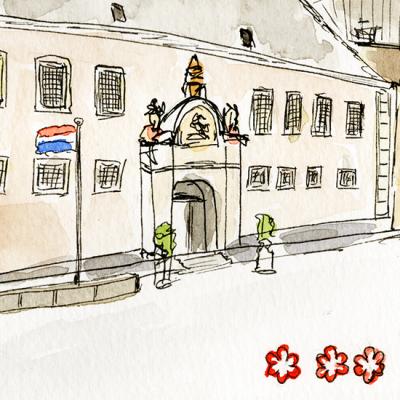 Een sfeervolle aquarel- en inkttekening van de hoofdingang van het enige 3 sterren Michelin restaurant van Nederland.
