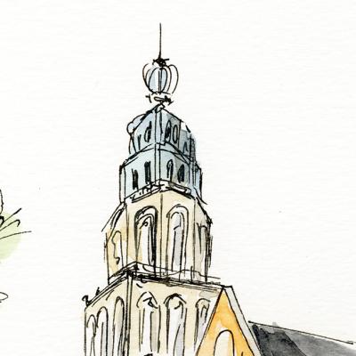 Breng de iconische trots van Groningen tot leven met deze handgetekende illustratie van de Martinitoren. Deze sfeervolle urban sketch in aquarel en inkt viert de historische schoonheid van d’Olle Grieze en de Martinikerk.