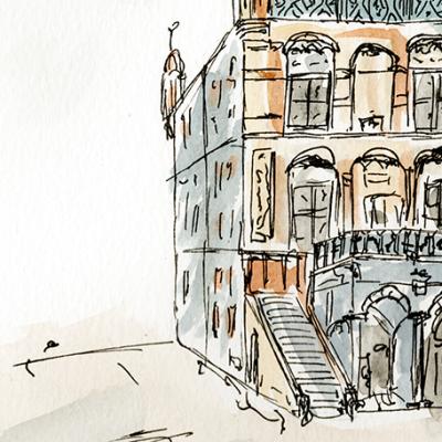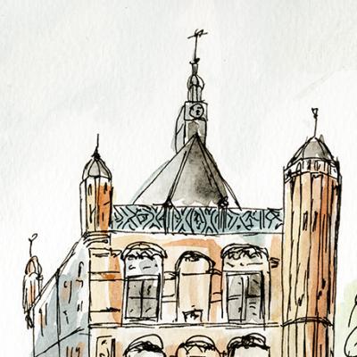 Ontdek de pracht van Hanzestad Deventer met deze artistieke illustratie van De Waag. Deze sfeervolle urban sketch in aquarel en inkt brengt het oudste waaggebouw van Nederland op unieke wijze tot leven.