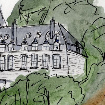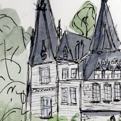 en charmante aquarel- en inkttekening van het Kasteel van Durbuy, genesteld in het weelderige groen van de Belgische Ardennen.