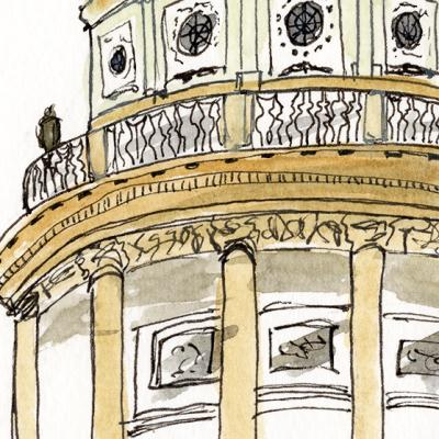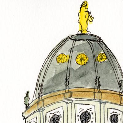 en gedetailleerde aquarel- en inkttekening van de karakteristieke koepel van de Franse Dom in Berlijn, uitgevoerd in warme oker- en grijstinten met gouden accenten.