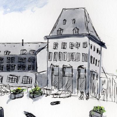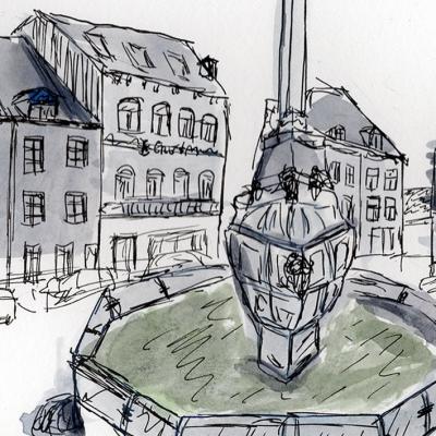 Een sfeervolle inkt- en aquarelschets van de Place Saint-Remacle in Stavelot, met de iconische fontein en het Perron-monument als stralend middelpunt.