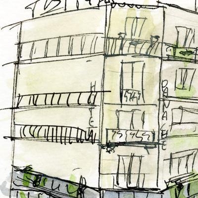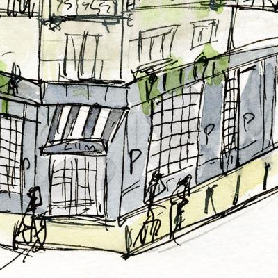 Een karakteristieke inkt- en aquarelschets van Hotel Panache in Parijs, met zijn opvallende blauwgrijze gevel op de begane grond en klassieke Parijse uitstraling.
