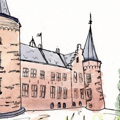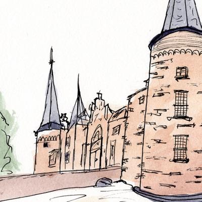Een sfeervolle aquarel- en inkttekening van Kasteel Helmond, een imposante middeleeuwse burcht die al 700 jaar het trotse middelpunt van de stad vormt.