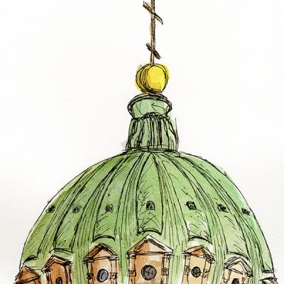 Een aquarel- en inkttekening van de karakteristieke groene koepel van de Dom van Helsinki, bekroond met een gouden bol en kruis.