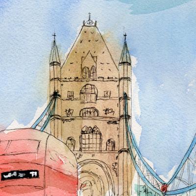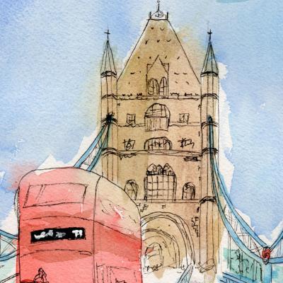 Een aquarelschets van de historische Tower Bridge in Londen, met een klassieke rode dubbeldekker op de voorgrond. De losse inktlijnen en zachte kleuren creëren een levendige indruk van de stad.