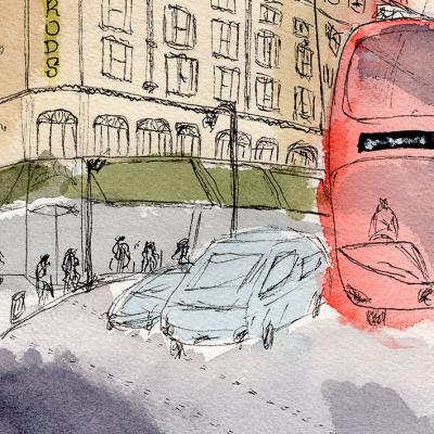 Galerij → Europese (hoofd) steden → Waterverf schilderijen → Londen Luxe: Harrods en de Rode Bus