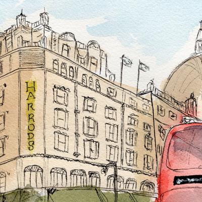 Een levendige aquarelschets van het beroemde warenhuis Harrods in Knightsbridge, compleet met een iconische rode bus en het bruisende stadsleven van Londen