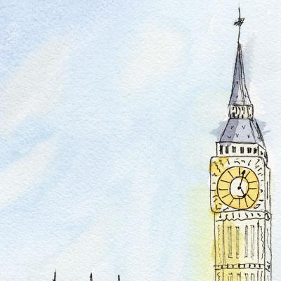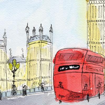 Een aquarelschets van een iconisch Londens tafereel, met de Elizabeth Tower (Big Ben) en een traditionele rode dubbeldekker bus als de belangrijkste onderwerpen. De losse inktlijnen en zachte aquarelwassingen creëren een levendige, spontane indruk van de stad.