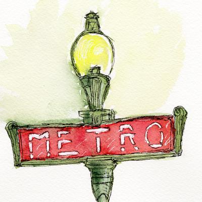 Aquarelschets van een iconisch Parijs "Metro"-bord met moderne stijl.