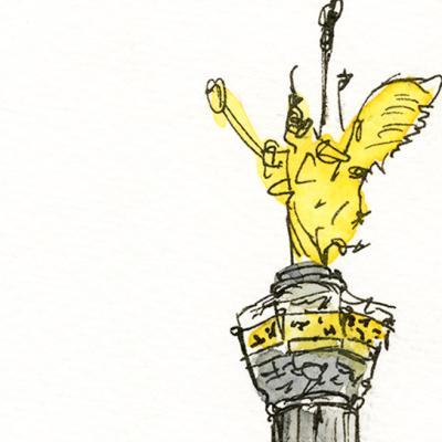 Een aquarel- en inkttekening van de beroemde Siegessäule in Berlijn, met de iconische gouden Victoria als stralend middelpunt.